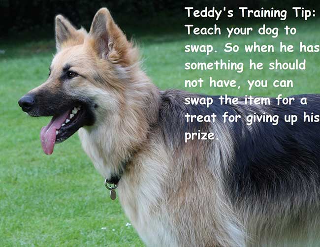 Teddy’s Training Tip: Teach your dog to swap. So when he has something he should not have, you can swap the item for a treat for giving up his prize.