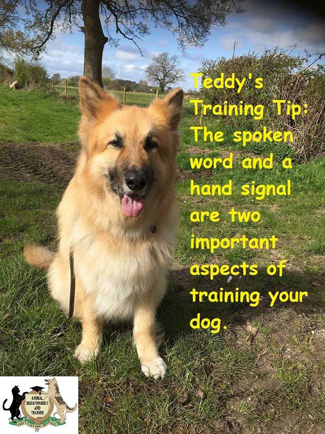 Teddy’s Training Tip: The spoken word and a hand signal are two important aspects of training your dog.