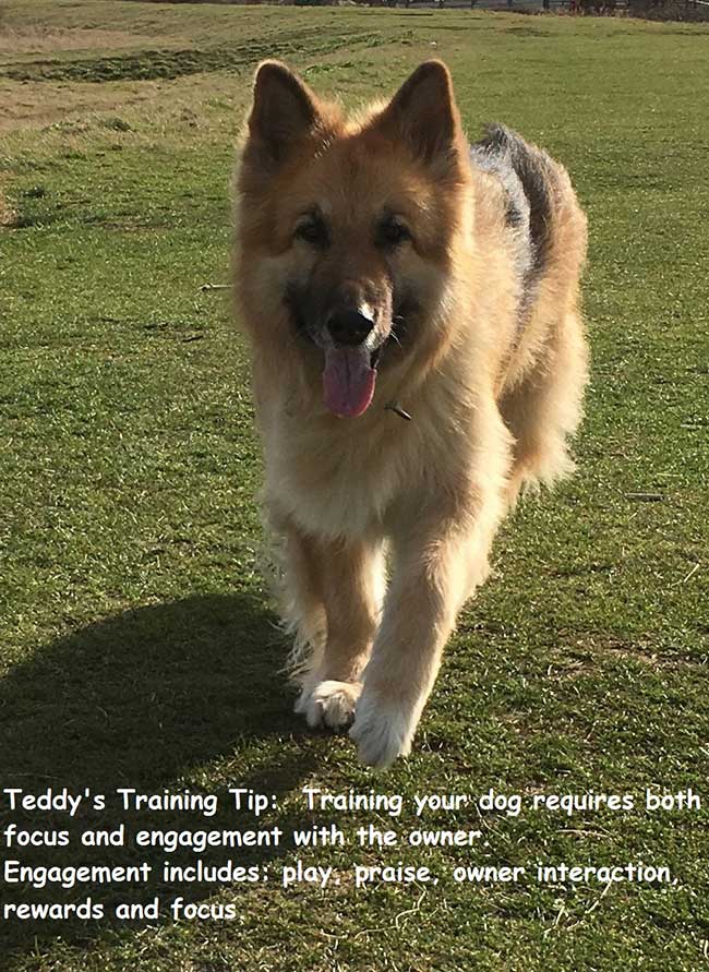 Teddy’s Training Tip: Training your dog requires both focus and engagement with the owner. Engagement includes: play, praise, owner interaction, rewards and focus.